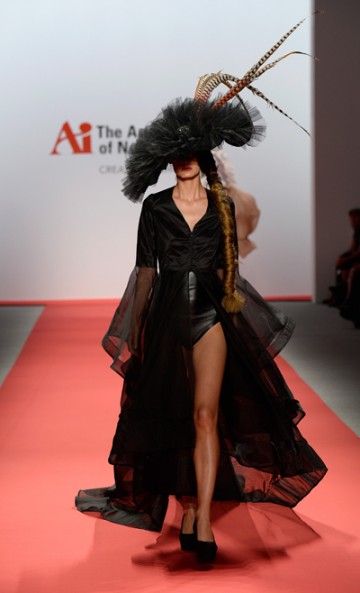 (Betsey Johnson): "Hmm...let's dress up a model in hospital whites, to make her look like an escapee. We'll put a wig on her so she looks like that vacuuming woman in Something About Mary. We'll wrap her wrists and hands in gauze, like a boxer. We'll apply lipstick so garish her mouth will look like a bird's beak. We'll hang a small license plate around her neck. And we'll have her stride extra jauntily down the runway singing to herself. No one will think she has anything in that box but a severed human head. Yeah -- that's crazy!"